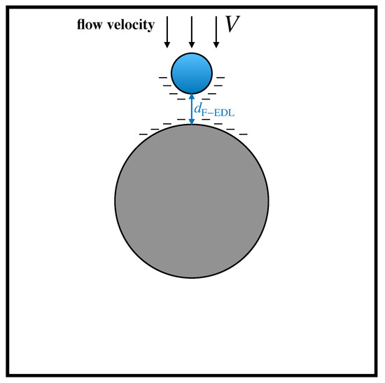 Amongst the fluid-mediated surface interactions between solids, electrostatic forces are expected to be of primary importance. In the specific context of DLD devices, recent articles by Zeming et al. [33,34] showed that particle–obstacle electrostatic interactions can significantly impact the dynamics of suspended particles in DLD arrays. These interactions originate from the existence of an Electric Double Layer (EDL) at the solid–fluid interface. The overall effect of the EDL is to induce a net charge distributed onto the solid surfaces, characterized by a surface charge density . In the case where the sign of is the same for both the obstacle and the particle surfaces, a repulsive force arises, which prevents the particle to collide with the obstacle. In [33], the authors proposed a simple lumped approach to account for electrostatic forces based on the concept of electrostatic displacement . This quantity is defined as the equilibrium distance between the obstacle boundary and the surface of a particle, which is subject to the viscous drag force of the surrounding fluid flowing with characteristic velocity V on the one hand, and of the electrostatic repulsion between the charged surfaces on the other, as depicted in Figure 6.