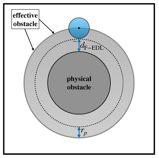 - Based on the nature of the solid surfaces and the ionic concentration of the buffer solution suspending the particle, compute the surface densities and , and the bare particle diffusivity from the Stokes–Einstein relation. Then, use Equation (4) to compute the electrostatic displacement, and obtain the effective particle radius defined by Equation (5). For a particle of assigned size, the effective particle radius defines the extent of the effective obstacle depicted in Figure 7 and therefore the region accessible to the center of the particle.