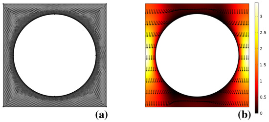 Figure 8b shows the solution of the Stokes problem for the pressure-driven flow through the unit cell with boundary conditions defined in the previous section, obtained by using a commercial finite element solver (Comsol Multiphysics 5.2). The unstructured mesh used for the numerical solution is depicted in (a). As can be gathered, due to the linearity of the laminar flow problem, no sharp boundary layers are observed, making it numerically straightforward to obtain the flow solution at modest computational expenses.