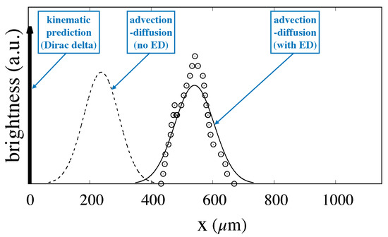 Comparison between the experimental values of the fluorescence intensity at a distance downstream the particle feeding source for particles of size and the distribution resulting from the fitting of the advection–diffusion model with electrostatic effect to the experimental data. Empty symbols: experimental values taken from [6]; Continuous line: advection–diffusion model with ED computed by assuming a value of that makes the mean value of the experimental and predicted distribution equal. Broken line: advection–diffusion model with no electrostatic effect. The thick arrow represents the Dirac delta distribution predicted by the kinematic theory for this system geometry and the chosen particle size. All of the distributions have been normalized so that they possess equal area.