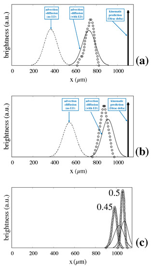 The data make it readily evident how the advection–diffusion model with ED effect constitutes a significant improvement over all previous approaches, especially as regards the predicted mean value, for which the error is within few percent for all particle sizes. Although an appreciable overestimation of the variance for the larger particle sizes can be noted, the relative error between experimental and predicted value is still below , even in the most critical cases of large size particles.