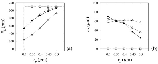 Comparison between predicted and measured values of the mean exit position, (a), and of the distribution variance (b) vs. particle size. The experimental values (solid bullets) are taken from [6] Dash-dotted line with empty squares: kinematic model; Dotted line with empty triangles: advection–diffusion model with no ED effect. Broken line with empty circles: advection–diffusion model with ED effect.