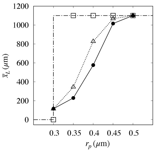 Because was fixed so that the average of the two distributions are equal to each other, the position of peaks nearly coincide (the small discrepancy is due to the asymmetry of the experimentally determined distribution). In addition, the good agreement between the width of the distributions is a first clear indication of the fitness of the model to describe the essential features of particle transport in DLD devices in that the variance constitutes a free parameter of Equation (3). It is worth mentioning that the estimate of the variance based on the bare particle diffusivity in place of the effective dispersion coefficient would yield a much more peaked distribution, with a variance about three times smaller with respect to the experimental value. The broken line in the same figure represents the prediction of the advection–diffusion model when the electrostatic force is not considered. As can be gathered from the comparison with the experimental data, the mean exit position is significantly underestimated when the electrostatic effect is not accounted for.