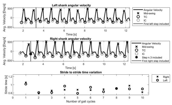 The data extraction process ignored the first gait cycle (i.e., first step each leg) and included data from the 3rd IC. Figure 1 represents angular velocity signal and the ICs (i.e., heel strike) and TCs (i.e., toe off) for the full length of a walking task.