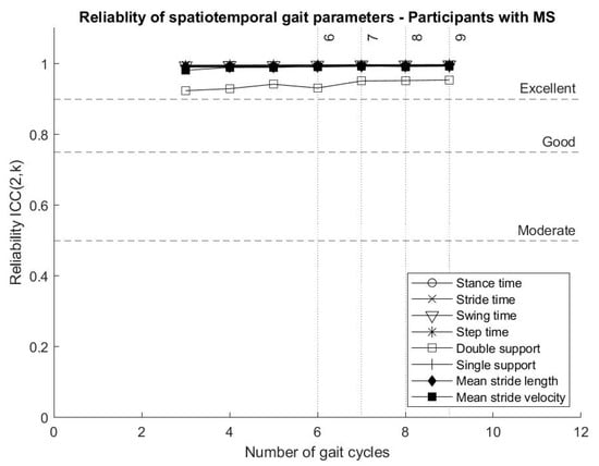 The analysis showed that spatiotemporal gait parameters calculated as the average across gait cycles, and representing bilateral gait collected from inertial sensor data, can reach “excellent” reliability from as few as three gait cycles. This result is in line with the literature, describing “good” test–retest reliability for mean stride length, mean stride velocity, mean stance time, mean swing time and mean double support for participants with MS [].