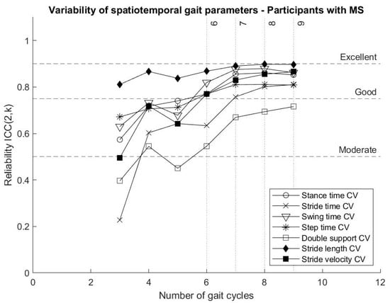 In the literature, many authors investigated the reliability of spatiotemporal gait parameters, in particular for measures of gait variability, recommending calculated measures should be carefully reported together with the length of the walking tasks and the test conditions [,,]. Different approaches have been used to estimate reliability, including sampling methods (i.e., bootstrapping) [], thresholds around the mean value [], analysis of variance of calculated measures [] and other specific methods estimating measurement errors through intraclass correlation coefficients [,,,]. In the present study, the ICCs were calculated to highlight differences according to the number of gait cycles included in the analysis and identify which gait parameters enable reliable measures for gait assessment of persons with MS when a restricted number of gait cycles are available.