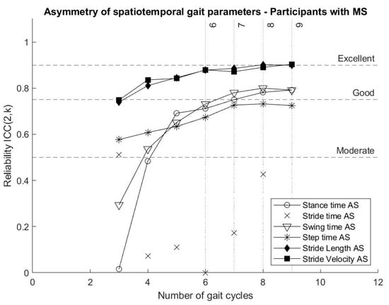 Variation of the reliability (ICCs) of asymmetry of spatiotemporal gait parameters for participants with MS according to the number of gait cycles included in the analysis.