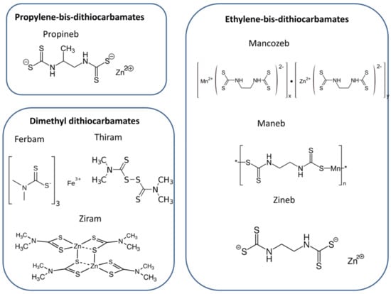 Dithiocarbamate fungicides (DTFs) are non-systemic pesticides that have been used since the 1940s to control a number of fungal diseases in various crops and ornamental plants. Propineb, zineb, maneb, thiram, and mancozeb are amongst some of the most well-known and used fungicides, the chemical structures of which are presented in Figure 1.