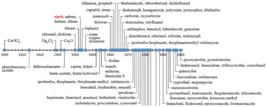 While the development of new pesticide molecules and formulations has continued over the years, currently used DTFs such as maneb, mancozeb, propineb, thiram, and ziram were introduced more than 50 years ago (Figure 2) []. Mancozeb, propineb, and thiram are among the top selling fungicides, e.g., mancozeb sales are expected to reach $18 billion by 2025 [].