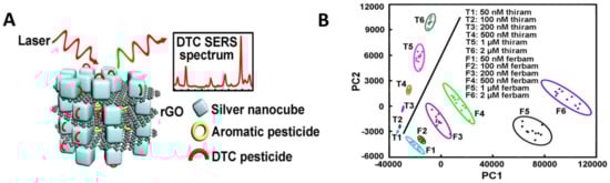 (A) Principle of the surface enhanced Raman scattering (SERS) detection of DTF using rGO-wrapped Ag nanocubes. (B) Principal component analysis (PCA) plot (PC1 versus PC2) of signals extracted from 10 SERS spectra of thiram and ferbam with concentration ranging from 50 nM to 2 μM. Reproduced from [] with permission.