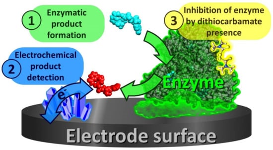 The detection of pesticides based on the principle of enzyme inhibition has long been explored as an alternative to chromatographic and spectroscopic methods. Various enzymes, including acetylcholinesterase, butyrylcholinesterase, alkaline phosphatase, organophosphorus hydrolase, the enzymatic complex of Photosytem II in plants, algae, and cyanobacteria, as well as urease, laccase, tyrosinase, and aldehyde dehydrogenase have been used for the detection of various classes of pesticides [,,,]. DTFs are known inhibitors of aldehyde dehydrogenase, tyrosinase, and laccase, which led to the development of several biosensors that make use of these enzymes [,,,,,,].