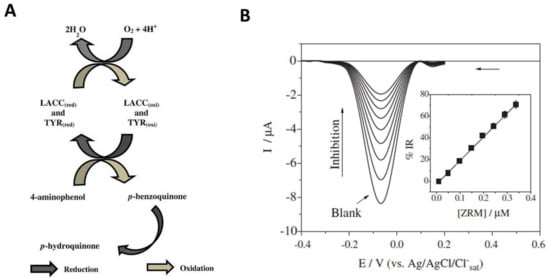 In addition to laccase, tyrosinase is another enzyme that is inhibited by DTFs. Tyrosinase (EC 1.14.18.1, monophenol, o-diphenol: oxygen oxidoreductase) catalyzes the oxidation of monophenols to o-diphenols, as well as the further oxidation of diphenols to their corresponding quinones. Tyrosinase is also inhibited by atrazine, hydrazines, and cyanide. In electrochemical biosensor investigations, tyrosinase was coupled with laccase in a biosensor for the detection of carbamate pesticides, achieving higher sensitivity than when each enzyme was used alone []. The mono and bi-enzymatic laccase biosensors were applied for the determination of ziram, as well as the carbamate pesticides carbofuran, formetanate carbaryl, and propoxur in spiked vegetables (tomato, potato) and citrus fruit (lemon, tangerine, and orange). According to the principle depicted in Figure 6A, 4 amino-phenol was used as an enzymatic substrate that was converted into p-benzoquinone under the catalytic action of tyrosinase and laccase. The magnitude of the cathodic current due to the reduction of p-benzoquinone to p-hydroquinone was correlated with enzyme activity. The cathodic current decreased in the presence of ziram in a concentration dependent manner as depicted in Figure 6B.