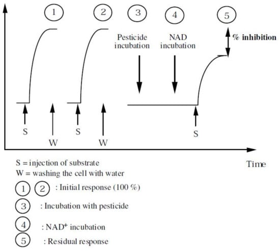 The critical factors affecting the analytical performance of the inhibition based enzymatic biosensors are: the amount of enzyme, the incubation time, the design of the device and of the sensing layer, including the matrix and type of immobilization of the enzyme. In general, as summarized in Table 3, the enzymes were entrapped in polymers by photopolymerization (e.g., in PVA-SbQ), adsorbed on electrochemically deposited films of Prussian Blue or were cross-linked with glutaraldehyde in a matrix of bovine serum albumin. The incubation time with the fungicide was less than 20 min. The design of the test must consider the reversibility and the mechanism of inhibition. For example, aldehyde dehydrogenase inhibition by dithiocarbamate fungicides is competitive versus the cofactor NAD+ and is irreversible. Therefore, the analytical signal is registered first in the absence of the fungicide, to get a reference signal, then the NAD+ is eliminated by washing and the signal is recorded in the absence of the cofactor. Next, the biosensor is incubated with the fungicide, followed by a short incubation with NAD+ and by the addition of the substrate, before recording the final signal. The biosensor is discarded after this, since the original activity of the enzyme cannot be restored (Figure 8).