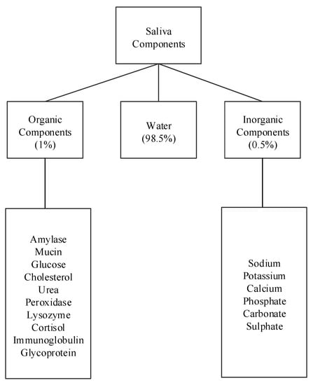 Human saliva comprises water (98.5%), organic (1.0%), and inorganic (0.5%) components as shown in Figure 1. Organic components include proteins, enzymes, mucin and nitrogenous products, such as urea, generated by the human body. Inorganic components are a variety of electrolytes found in saliva and the human body. While the daily average flow of saliva is between 1 to 1.5 L, the concentration of the organic and inorganic components in saliva is small. The small concentrations of these components in saliva impose challenges for their detection in saliva. For example, some components can be detected in saliva, such as amylase, mucin, glucose, cholesterol, urea, peroxidase, lysozyme, and cortisol, while others, such as immunoglobulin and other glycoproteins are found in saliva in such small concentrations that sensors that detect these components focus on serum obtained from blood [,]. Inorganic components detectable in saliva are cations, such as sodium, potassium, and calcium, and anions, such as chloride, phosphate, and sulphate.