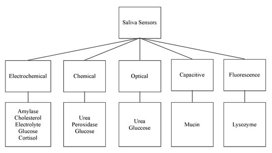 The following sensors are designed to detect the organic salivary components and measure their concentration. The paper presents a classification of sensors according to their working principle, target component, and technology used. Figure 2 shows the surveyed salivary component sensors and their different detection working principles: electrochemical, optical, chemical, capacitive, and fluorescence.