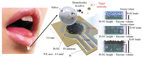 - Eom, K.S.; Lee, Y.J.; Seo, H.W.; Kang, J.Y.; Shim, J.S.; Lee, S.H. Sensitive and non-invasive cholesterol determination in saliva via optimization of enzyme loading and platinum nano-cluster composition. Analyst 2020, 145, 908–916. [Google Scholar] [CrossRef] [PubMed]