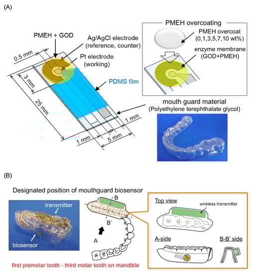 Arakawa et al. [] proposed a mouthguard cavitas sensor to detect salivary glucose. This glucose sensor consists of a platinum and silver/silver chloride electrode (Ag/AgCl), with glucose oxidase (GOD) immobilized by poly2-methacryloyloxyethyl phosphorylcholine-co-2-ethylhexylmethacrylate (PMEH) on a custom-fitted monolithic mouth-guard. It has a wireless transmitter for telemetric measurement of saliva glucose. A 0.5 mm-thick layer of polyethylene terephthalate glycol (PETG) is selected as part of the structure to demonstrate a strong adhesion of Pt and Ag to PETG. This sensor has GOD and a PMEH overcoat applied to the sensing region. PMEH over-coating increases the sensitivity of the sensor. The biosensor is capable of real-time continuous wireless measurement of glucose in artificial saliva from 5–1000 mol/L with a phantom jaw. Figure 6 shows the mouthguard sensor and its operation.