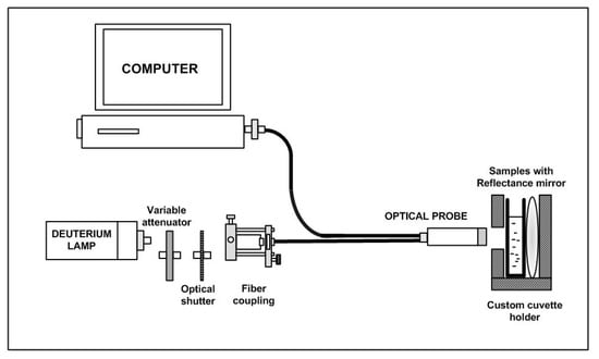 Yazid et al. [] proposed an optical sensor to detect dental caries by detecting the amount of amylase in saliva. Amylase can be detected on the basis of optical absorption using an ultraviolet-visible (UV-VIS) spectrometer. The alpha-amylase is absorbed by light at a specific wavelength. When the light at those wavelengths passes through the saliva specimen, some of the light is absorbed by the solute and some other passes through the sample. This difference in the original and transmitted light is called absorbance. The spectrometer detects the absorbance at around 280 nm. The quantity of saliva used for the detection is 2 mL. Six core fibers deliver the UV light to the saliva sample and one fiber in the middle collects the reflected light back to the other end. The sample is placed in a special 350 L quartz cuvette, which allows the transmission of UV light. The reflected UV light is measured by the high-resolution UV–VIS spectrometer, which is capable of detecting a wavelength range from 200 nm to 1100 nm at 0.01 nm resolution. It is observed that the absorbance of the saliva samples of a healthy group are the lowest as compared to that of a low caries group and high caries group, because of the amylase concentration. Figure 7 shows the optical detection of amylase.