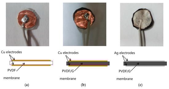 The morphology of a PVDF/G membrane was tested. In this case a layer of silver paint was used as electrode. The samples with electrodes are (a) PVDF-Cu; (b) PVDF/G-Cu, and (c) PVDF/G-Ag samples [].