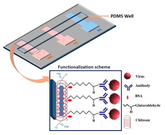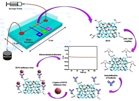 - Singh, R.; Hong, S.; Jang, J. Label-free detection of influenza viruses using a reduced graphene oxide-based electrochemical immunosensor integrated with a microfluidic platform. Sci. Rep. 2017, 7, 42771. [Google Scholar] [CrossRef]