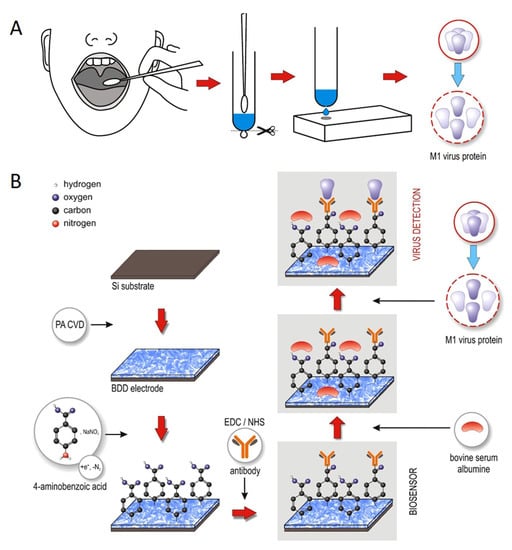 - Nidzworski, D.; Siuzdak, K.; Niedziałkowski, P.; Bogdanowicz, R.; Sobaszek, M.; Ryl, J.; Weiher, P.; Sawczak, M.; Wnuk, E.; Goddard, W.A.; et al. A rapid-response ultrasensitive biosensor for influenza virus detection using antibody modified boron-doped diamond. Sci. Rep. 2017, 7, 1–10. [Google Scholar] [CrossRef]