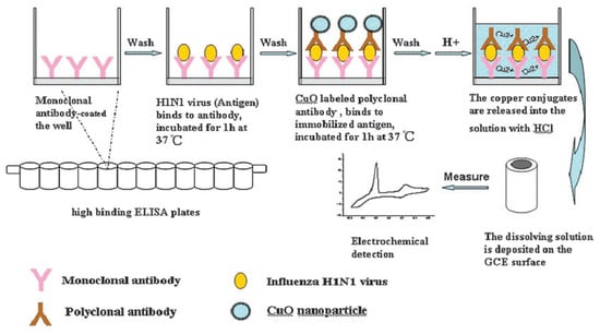 - Li, Y.; Hong, M.; Lin, Y.; Bin, Q.; Lin, Z.; Cai, Z.; Chen, G. Highly sensitive electrochemical immunoassay for H1N1 influenza virus based on copper-mediated amplification. Chem. Commun. 2012, 48, 6562–6564. [Google Scholar] [CrossRef]
