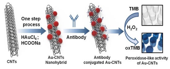 - Ahmed, S.R.; Kim, J.; Suzuki, T.; Lee, J.; Park, E.Y. Enhanced catalytic activity of gold nanoparticle-carbon nanotube hybrids for influenza virus detection. Biosens. Bioelectron. 2016, 85, 503–508. [Google Scholar] [CrossRef] [PubMed]