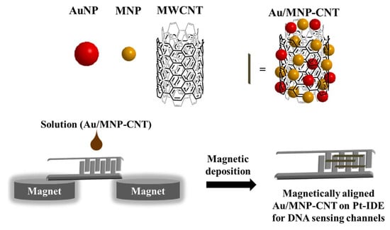 - Lee, J.; Morita, M.; Takemura, K.; Park, E.Y. A multi-functional gold/iron-oxide nanoparticle-CNT hybrid nanomaterial as virus DNA sensing platform. Biosens. Bioelectron. 2018, 102, 425–431. [Google Scholar] [CrossRef] [PubMed]