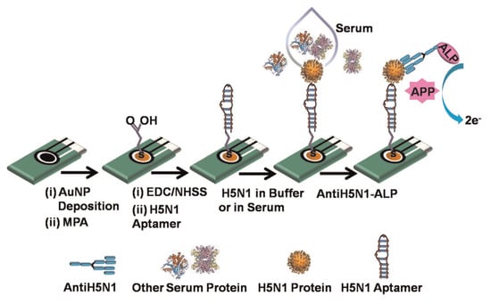 - Diba, F.S.; Kim, S.; Lee, H.J. Amperometric bioaffinity sensing platform for avian influenza virus proteins with aptamer modified gold nanoparticles on carbon chips. Biosens. Bioelectron. 2015, 72, 355–361. [Google Scholar] [CrossRef]
