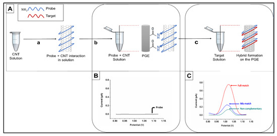 Prior to probe immobilization, PGE electrodes were activated at 1.40 V for 30 s in acetate buffer solution (ACB, 0.5 M acetic acid, pH 4.8). Probe immobilization was carried out on the surface of the PGEs. The probe and CNTs were allowed to interact in solution as previously described [33]. Briefly, CNTs were added to ACB at a concentration of 1 mg/mL and sonicated for 4 h under ambient conditions. Then, probe DNA was added to the CNT suspension to obtain 5 µg/mL final concentration and the suspension was mixed at 600 rpm for a period of 30 min at 30 °C. Subsequently, each PGE was incubated in separate vials containing 30 µL of the probe-wrapped CNTs for immobilization on the electrode surface over the period of 1 h.