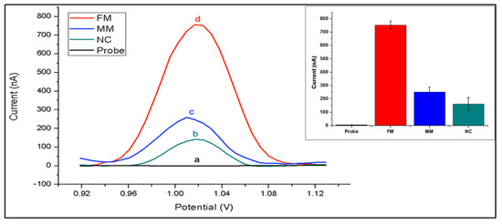 Differential pulse voltammograms of different modified electrodes in 0.5 M ACB: (a) inosine-substituted probe-modified PGE before hybridization; after hybridization with (b) non-complementary sequence (NC), (c) sequence with two mismatched bases (MM) and (d) fully complementary target sequence (FM). Inset: histogram chart of guanine oxidation signals obtained under optimized conditions.