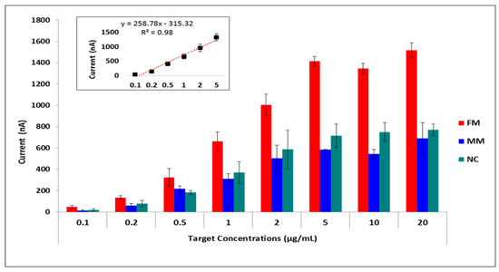 The testing conditions were optimized using synthetic target sequences in order to increase both the selectivity and specificity of hybridization. For selectivity, differences between guanine oxidation signals after hybridization with a complementary target and after hybridization with a non-complementary (FM = full match/NC = non-complementary) synthetic target sequence was obtained. To assess the efficiency of mutation detection, differences in guanine signals obtained from hybridization with a complementary synthetic target and from hybridization with a synthetic target containing two base mutations in the sequence region of interest (FM/MM = mismatch) was obtained. By varying only the probe concentrations ranging from 0.1 to 10 µg/mL, we found that the highest FM/NC and FM/MM values were obtained at 5 µg/mL probe concentration (Table S1). Then we fixed the probe concentration at 5 µg/mL and applied increasing target concentrations ranging from 0 to 50 µg/mL. Hybridization signals increased until the target concentration reached 5 µg/mL, after which the hybridization signal remained almost constant (Figure 4, Table S2). The relative standard deviations of the measurements showed that results were more reproducible and accurate with the lowest error bars at 5 µg/mL target concentration regarding the full-matched hybridization (Mean of the hybridization signal was 1.40 µA with a relative standard deviation of % 1.57 for 5 µg/mL target concentration). Furthermore, the effects of hybridization buffer, washing buffer, and hybridization time were studied (Figure S1 and Tables S3–S5). A hybridization buffer containing 5× SSC +% 0.05 SDS, washing buffer containing 1× SSC +% 0.1 SDS, and 1 min washing time was chosen as optimum conditions by means of highest specificity and selectivity (Tables S1–S5).