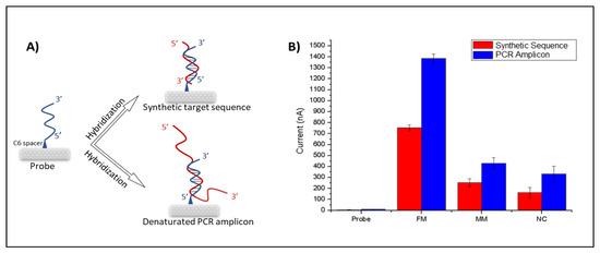 (A) Schematic illustration of probe immobilization onto PGE and its hybridization with denatured bona fide PCR amplicon and complementary synthetic target sequence. (B) Histogram of voltammetric guanine oxidations signals at +1.0 V obtained for synthetic sequences and denatured PCR amplicons at the same conditions: the probe (before hybridization), FM (probe + target), MM (probe + mismatch target) and NC (probe + non-complementary target).