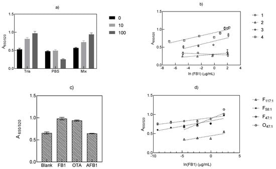 Effect of the incubation of aptamer 40 nt with FB1 on the A650/520 ratio in (a) Tris-HCl buffer 31.1 mM, PBS 12.79 mM (NaCl equivalence) and a combination of both (Mix) to a final concentration of 31.1 (Tris-HCl) and 12.79 mM (PBS in NaCl equivalence), under the same binding conditions (n = 6), and (b) different buffers at the conditions outlined in Table 1 (the numbers correspond to each assay, n = 3). (c) Specificity of assay 4 incubated with other mycotoxins (13.8 µM, n = 4) and (d) the effect of the reduction in the aptamer: AuNP molar ratio (as shown in the legend subscripts) in the incubation with FB1 (F) and OTA (O)(n = 4).