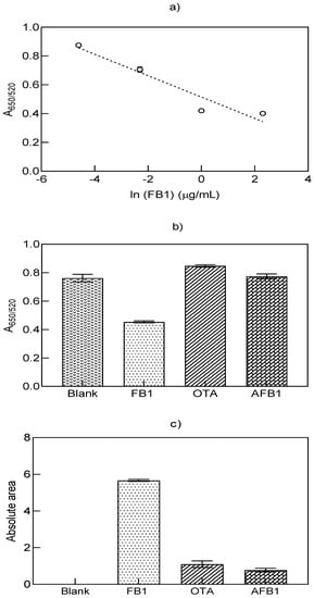(a) Standard curve for the quantification of FB1 with aptamer 96 nt in MgCl2 through the analysis of the A650/520 ratio. Specificity test under the presence of FB1, AFB1 and OTA at a concentration of 1.38 µM for the (b) A650/520 ratio and the (c) absolute area values (n = 3).