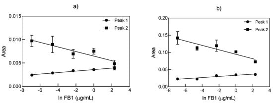 Even though the retention time during AF4 fractionation can be correlated with particle size, and the MALS signal detection can be used for the determination of the radius of gyration [,], in our study, we focused on the analysis of the peak areas of the different signals. Therefore, the effect of FB1 on the functionalization of AuNPs with aptamers was studied as a whole system, regardless of the differences in the absolute particle size. Despite the initial characterization purpose for the application of AF4 on the conjugates at varying FB1 concentrations, the low LODs achieved, especially after analyzing the peak areas at 600 nm (56 fg/mL), unveiled its promising usage as a biosensing technique.