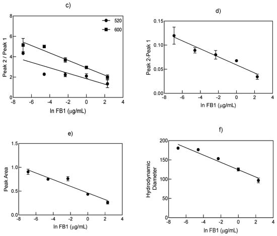 Standard curves for the quantification of FB1 with aptamer 96 nt through the analysis of the AF4 fractograms from the UV-Vis peak areas at (a) 520 nm, (b) 600 nm, (c) peak ratio between Peak 2 (larger particles) and Peak 1 (smaller particles), (d) peak area differences at 600 nm, (e) MALS peak area at 28° and (f) hydrodynamic diameter determined by DLS for the Aptamer (96 nt)–FB1–AuNPs conjugates in NaCl 0.2 M (n = 3).