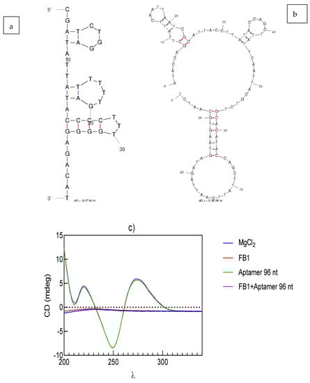 Predicted folded structures of (a) aptamer 40 nt (dG = −8.07), (b) aptamer 96 nt (dG = −12.46), and (c) circular dichroism spectrum of aptamer 96 nt in the absence and presence of 10 µg/L FB1 incubated in MgCl2.