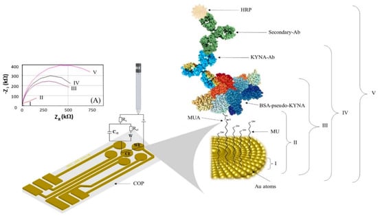 Schematic representation of the electrochemical impedance spectroscopy (EIS) electrochemical characterization of the functionalized sensor. (A) Nyquist plot for each respective immobilization (blue: bare Au, red: SAM, purple: BSA-pseudo-KYNA, black: KYNA-Ab, fuchsia: secondary-Ab).