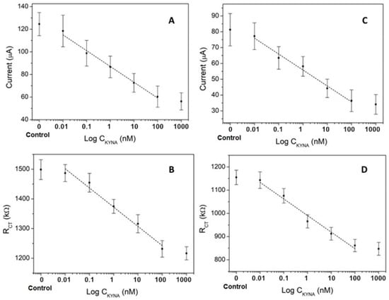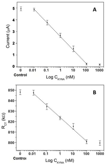 Similar calculations were done for the EIS results, and the behavior observed in this technique was comparable to CA, as shown in Figure 4B. There was a decrease in Rct when the concentration of KYNA increased. In this case, the Rct is produced by the presence of KYNA-Ab adhered to the surface of the sensor, which hinders the electron transfer of ferricyanide. Therefore, the higher concentration of KYNA reduces the presence of KYNA-Ab on the sensor surface, resulting in a lower Rct.