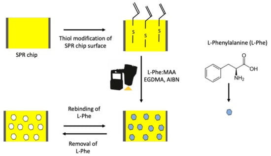 In the first step, the pre-complex was prepared with the model molecule l-Phe (8.0 mg) and N-methacryloyl l-phenylalanine (MAPA, 6.9 μL) monomer in 1:3 molar ratio at room temperature for 2 h. The synthesis procedure of the MAPA functional monomer was reported in our previous study [26,27]. The prepared pre-complex was mixed with HEMA (6.1 μL), EGDMA (56.5 μL). After, the AIBN (2 mg) was added to this monomer mixture. Then, 5 μL of this solution was dropped onto the SPR gold chip surface using a spin coater. It was then allowed to polymerize under UV light (100 W, 365 nm). The non-imprinted polymeric film onto the allil mercaptane modified SPR chip gold surfaces of SPR chip were prepared without l-Phe (Figure 1).