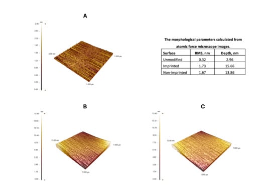 AFM images of SPR sensor surfaces (A: bare gold SPR surface, B: l-Phe imprinted SPR sensor, C: non-imprinted SPR sensor).