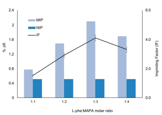 The imprinting factors at different molar ratios of l-Phe: MAPA were determined for the preparation of l-Phe imprinted and non-imprinted polymeric film in Figure 4. It was showed that the acquired %ΔR value of l-Phe imprinted polymeric films was higher than the non-imprinted polymeric films. l-Phe molecules are successfully located on binding sites molecular cavities according to the results. Maximum imprinting factor value was observed at 1:3 molar ratio of l-Phe: MAPA because of the potential stoichiometric ratio.