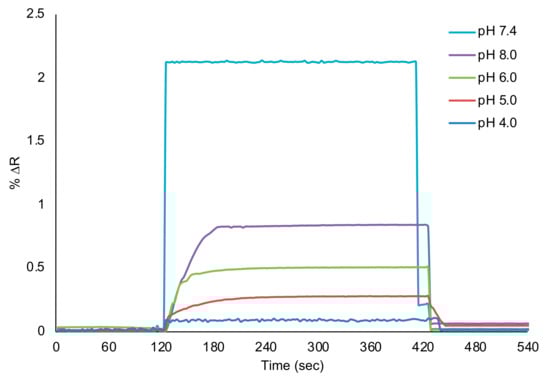 Kinetic studies were carried out using acetate–phosphate buffers at different pH ranges (pH 4.0–8.0). Aqueous solutions of l-Phe were applied to the SPR system in 50 μM of l-Phe for pH analysis in Figure 5. As seen in Figure 5, pH 7.4 phosphate buffer was chosen as the working medium for the detection of l-Phe in kinetic analysis. According to the kinetic analysis results, the decrease in the sensogram signal was determinative in other buffer systems. It is known that the pH value of the medium affects the complexation reaction between l-Phe and MAPA functional monomer.