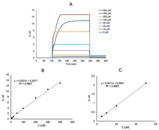 Real-time responses: (A) linear regions between 5–400 μM (B) and 5–50 μM (C) of SPR sensors aqueous solutions of l-Phe at different concentrations.