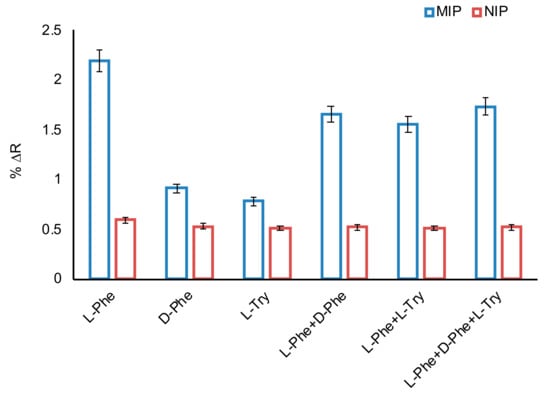 To determine selectivity of the imprinted sensor, a non-imprinted sensor was also prepared. Selectivity studies of l-Phe imprinted and non-imprinted SPR sensors were performed with competitive molecules such as d-phenylalanine, (d-Phe) and l-tryptophan (l-Try). These competitive molecules, which are close to l-Phe in terms of both molecular weight and structure are used in the selective studies. For selectivity studies, l-Phe imprinted and non-imprinted SPR sensors were kept constant as 50 μM in phosphate buffer (pH 7.4) of each competitive molecule (Figure 7). l-Phe imprinted SPR sensor was 2.31 and 2.71 times more selective for l-Phe than d-Phe and l-Try, respectively (Table 2). The results showed that the l-Phe imprinted (MIP) SPR sensor had higher adsorption capacity for l-Phe in comparison to d-Phe and l-Try due to selective cavities in the polymeric film on sensor surface. To compare the selectivity of the l-Phe imprinted sensor, a non-imprinted sensor was also prepared and the response (∆R) of the non-imprinted sensor to l-Phe, d-Phe and l-Try was obtained as 0.59, 0.53 and 0.51, respectively. According to the results, the non-imprinted (NIP) SPR sensor had less selectivity than the MIP sensor to l-Phe, due to a lack of l-phenylalanine selective cavities. The relative selectivity coefficient (k’) indicates the affinity of the l-Phe repressed recognition regions. According to the relative selectivity coefficients, the MIP sensor can recognize l-Phe as 2.08 times more selective than d-Phe; and 2.34 times more selective than l-Try, which includes indole ring. Additionally, it can be said that the prepared l-Phe MIP sensor is an effective sensor in the recognition of the d and l-enantiomers of the phenyl alanine amino acid. The fact that the other competitor amino acid tryptophan, which is a hydrophobic amino acid, is not structurally compatible with l-Phe specific cavities in the imprinted sensor with the indole ring it contains, may explain the higher selectivity. As can be seen from the results, the molecular imprinting process brought high selectivity to the prepared sensor.