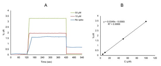 To show the reproducibility and practicality of the prepared l-Phe imprinted SPR sensors in the clinical analysis, a different concentration of l-Phe was spiked to artificial plasma samples. The aqueous solutions of l-Phe at a concentration from 10 μM to 50 μM were spiked in the diluted artificial plasma 1/5 (v/v). Firstly, the l-Phe imprinted SPR sensor was washed with deionized H2O, then pH 7.4 phosphate buffer was applied to the SPR system for 2 min. After, artificial plasma without spiked l-Phe was applied to the SPR system. Then, artificial plasma samples spiked with l-Phe at a concentration of 10 μM and 50 μM were applied to the SPR system for 5 min (Figure 8A). Removal of l-Phe bounded onto SPR sensor surface was used with 0.1 M NaCI as desorption agent for 3 min. The % change in reflectivity (%ΔR) of SPR sensor was monitored in all kinetic analysis in the SPR sensors. The linear requation in the linear range of 5.0 to 100 μM concentration was y = 0.0349x − 0.0565 with a coefficient of determination of 0.999 (Figure 8B). To determine the reliability and accuracy of SPR sensor and ELISA, the recovery was calculated (%) (Table 3).