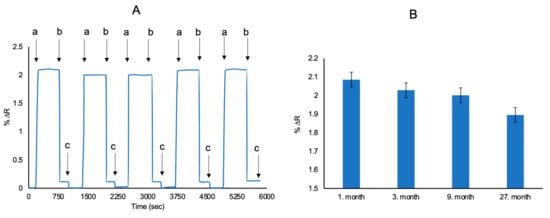 Reproducibility of l-Phe imprinted SPR sensors (A) and short-term and long-term stability of l-Phe imprinted SPR sensors (B) (CL-Phe: 50 μM in all measurements) (equilibration (a), adsorption (b) and desorption (c)).