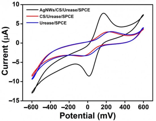 In this work, a nanocomposite material of AgNWs/HPMC/CS/Urease was coated onto SPCEs by a simple casting method and cyclic voltammograms (CVs) were measured (Figure 2). The electrochemical performance of the modified electrode was compared to a bare SPCE, and to Urease/SPCE, Chitosan/Urease/SPCE, and AgNWs-modified SPCEs. The CVs (Figure 2 and Figure S1, see Supplementary Materials) were scanned over the potential range −600 mV to 600 mV with a scan rate of 100 mVs−1 using a solution of 5 mM K3[Fe(CN)6] in 0.1 M KCl as a redox probe. Each electrode type showed well-defined but different redox response. The highest anodic and cathodic peak currents were obtained for the bare SPCE, with a peak potential separation (ΔEp) of 145 mV (Figure S1). After the urease enzyme was immobilized on the SPCE, the CV peak current reduced significantly while ΔEp increased to 250 mV, implying the successful immobilization of urease on the SPCE surface (Figure 2, blue line). The peak current response was reduced because the poorly conductive urease layer slowed the electron transfer kinetics at the working electrode. After a mixture of chitosan and urease (CS/Urease) was deposited on the SPCE electrode, the CV peak again showed lower peak current with ΔEp of 231 mV (Figure 2, red line), similar to that seen with Urease/SPCE. For the AgNWs-HPMC/CS/Urease-modified SPCE, however, higher peak currents were observed, with ΔEp of 190 mV (Figure 2, black line). Clearly, the presence of silver nanowires within the immobilized surface coating increased electrochemical response to the K3[Fe(CN)6] redox probe, and this was attributed both to an increased electroactive surface area and to improved electron transfer kinetics due to the excellent electrical properties of silver nanowires [,].