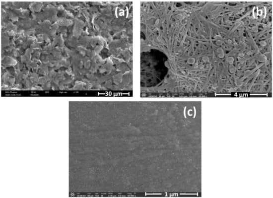 The surface morphologies of modified electrodes, including the bare SPCE, AgNWs-modified SPCE, and AgNWs/HPMC/CS/Urease-modified SPCE, were investigated by SEM (Figure 3a–c). A highly interpenetrated network of AgNWs was observed on the AgNWs-modified SPCE surface (Figure 3b and Figure S2). In contrast, the AgNWs/HPMC/CS/Urease-modified SPCE had a smoother surface, with the HPMC, chitosan, and urease solution apparently filling the gaps in the AgNWs network. This may be the ideal scenario, with the network of silver nanowires increasing the electroactive surface area and facilitating electron transfer with proximal adsorbates [].